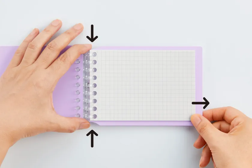 開け方は、リングの両端を押して、表紙を引っ張るだけ。軽い力で開け閉めができます。リングを押しただけでは開かないので、カバンの中で中身がばらける心配はありません。