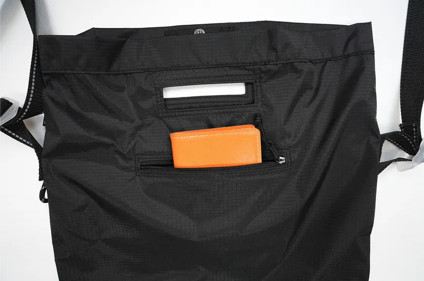 裏面にファスナーポケットがあり、頻繁に使用するスマートフォン、財布、鍵などをすぐに取り出せます。