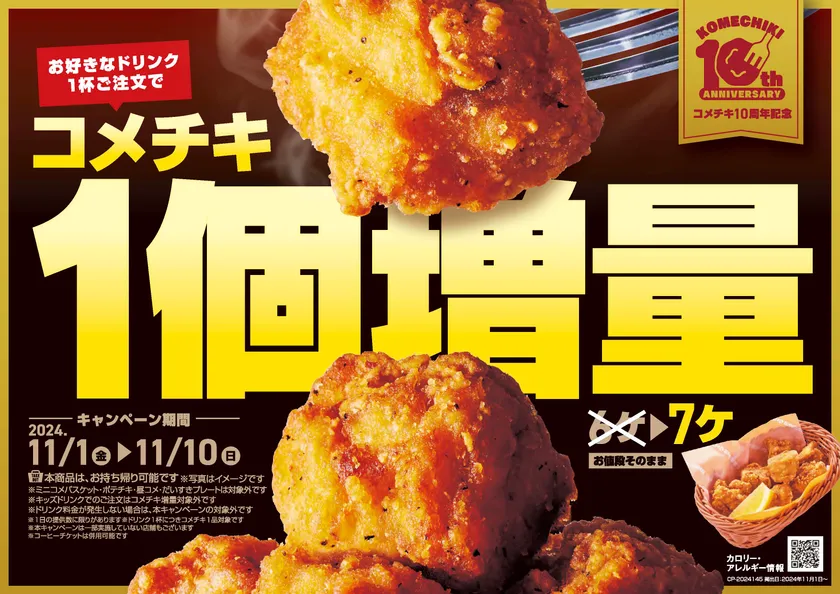 期間中に、お好きなドリンクと一緒にコメチキをご注文いただくと、お値段はそのまま、コメチキを1個増量して提供いたします。