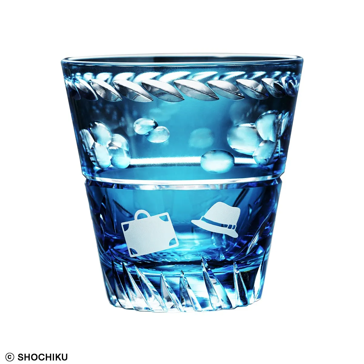 ねじり鉢巻や風に揺れる草の葉のモチーフが、白い雲とともに高度な切子カットでぐるりと刻まれ、おなじみの帽子とトランクも、サンドブラストで浮かび上がります。