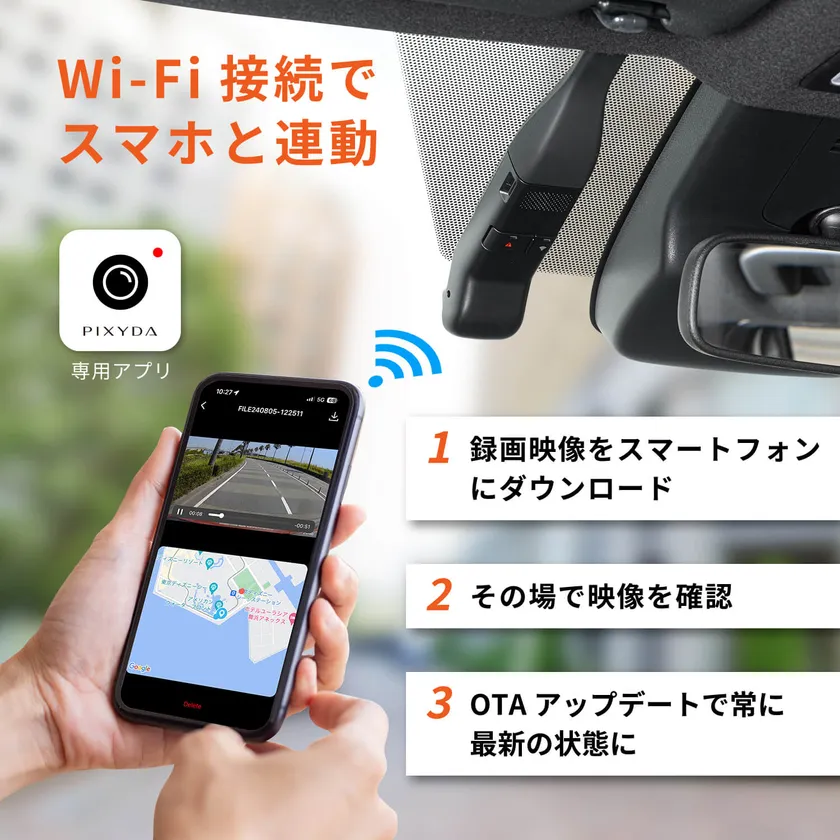 ●スマートフォンとのWi-Fi接続により、OTA(Over-The-Air)アップデートが可能。専用アプリを通じて、常に最新のソフトウェアへ自動更新され、ドライブレコーダーの性能や安全性を最適に保ちます。