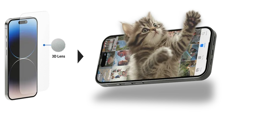 MOPICのスマートフォン向けグラスレス3Dソリューションは、スマートフォンの保護フィルムのように貼り付けて使用できる革新的な3Dレンズです。外観は一般的な保護フィルムに似ていますが、内部に精密な3Dレンズパターンが組み込まれているのが特徴です。これにより、ユーザーは専用の3Dメガネや追加の機器を必要とせず、肉眼で3Dコンテンツを楽しむことができます。さらに、本製品は9Hの強化ガラスを採用しており、通常のスマートフォン用保護ガラスとしても使用可能な実用性を兼ね備えています。