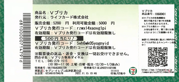 Vプリカ購入後、レジで受け取るチケットに【500円当たり!】等の記載があれば当たりです。