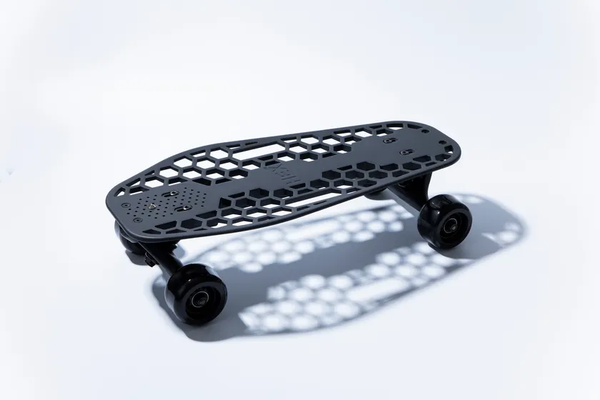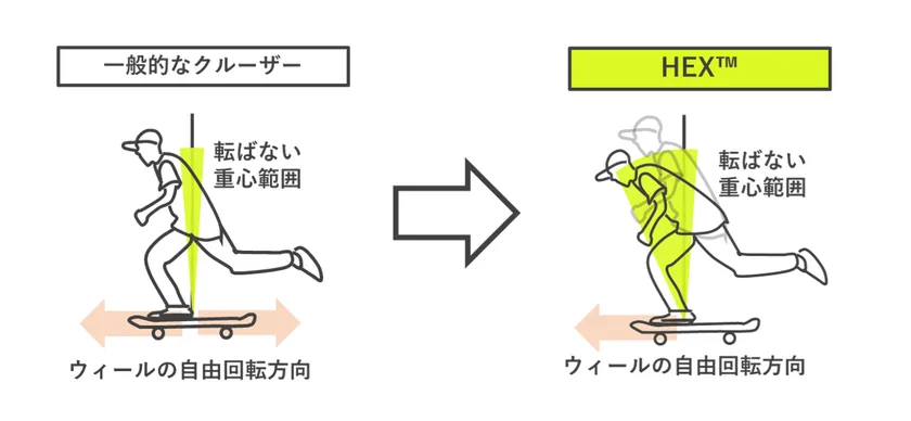 HEXは重心を取りやすい特殊構造(前にしか進まない構造)と乗りやすい幅、奥行きを維持しつつ六角格子構造のボードにすることで、軽量化と強度を両立しています。