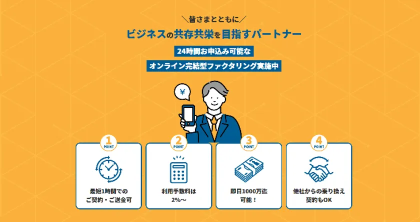 PCやスマホをご利用可能な環境であれば、お申込みフォームからのご依頼と必要書類をご提出いただくだけでご契約の流れが進行するオンライン完結型ファクタリングを実施しています。お申込み・お問合わせは24時間受付中であるほか、全国の事業者さまがご来店いただくことなくご利用可能です。