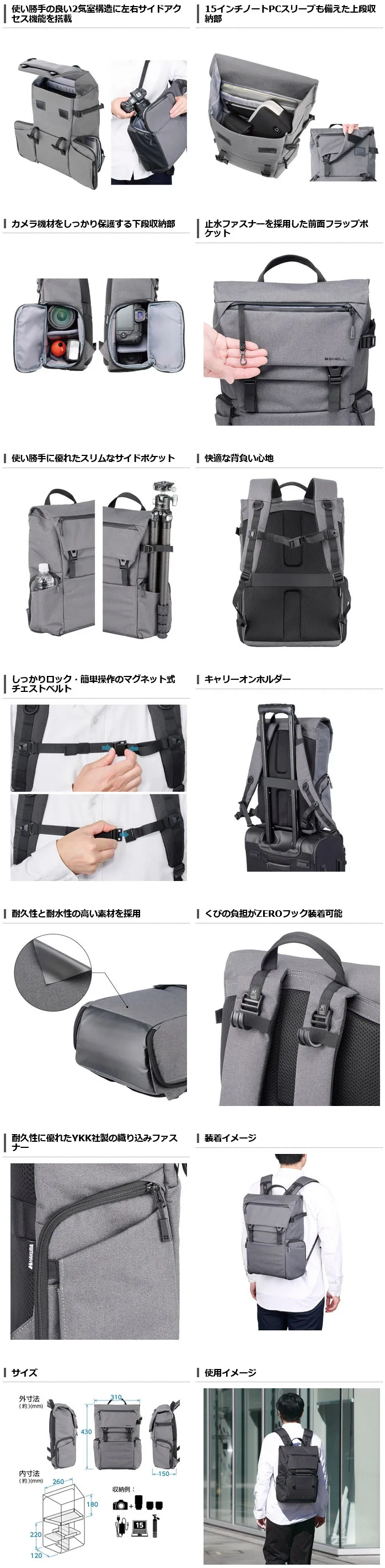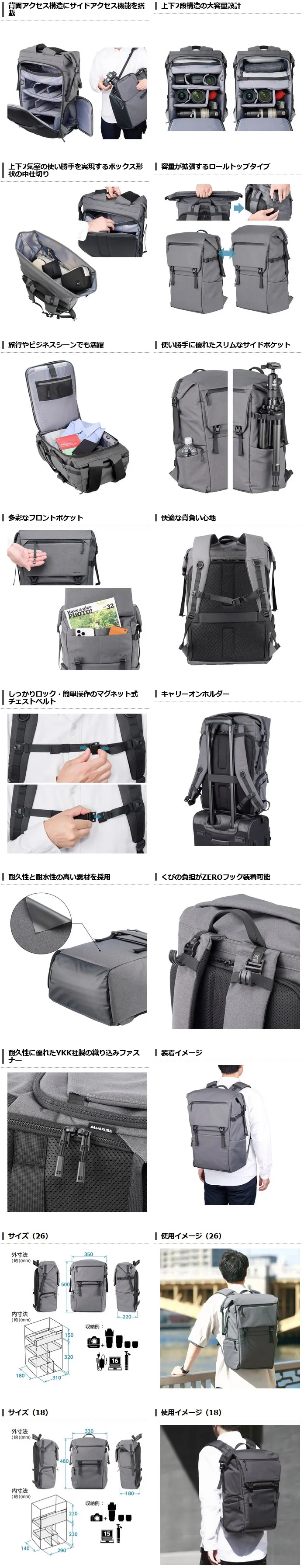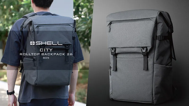 「ロールトップバックパック G05」は、機材を一目で確認して整理しやすい全面開口の背面アクセス構造に、バッグを下ろさずカメラを取り出せるサイドアクセス機能を装備。ボックス形状の上下仕切りにより、2気室タイプの使い勝手も兼ね備えたロールトップタイプのバックパックです。