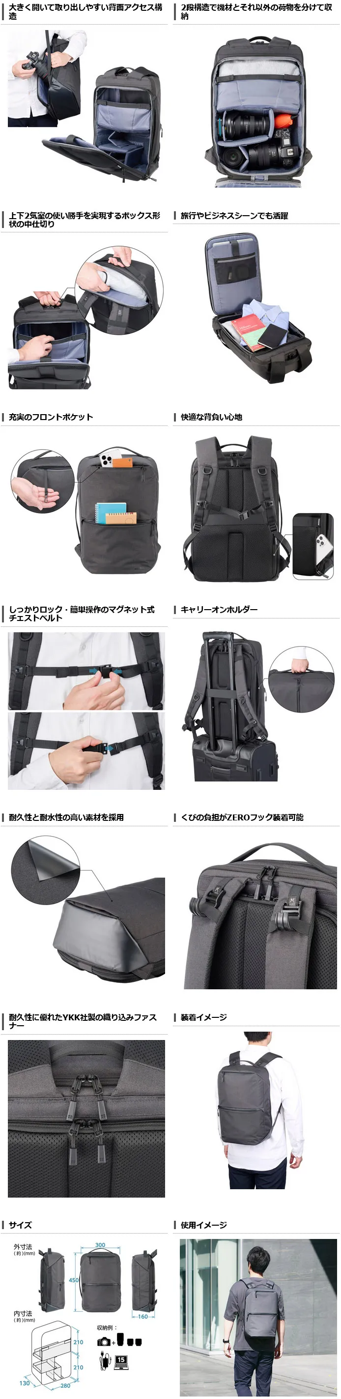 素早くアクセスが可能なカメラ収納部を備えたビジネスリュック風デザインのスリムなトートバックパック