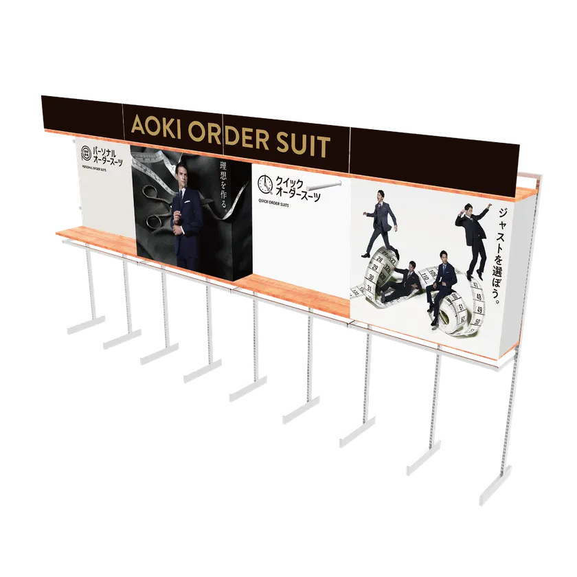 株式会社AOKI様のオーダースーツ売り場装飾に採用された実績をもとに、店舗ごとにサイズのカスタマイズが可能な仕様にてご提供。店舗のスタッフ様が簡単に設置できるため、全国規模の展開にも最適です。今後も、店舗プロモーションにおける新しい価値を提供し続けてまいります。