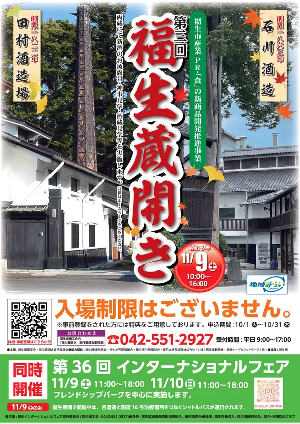 福生市商工会・福生蔵開き実行委員会が主催し、福生市の産業振興のため、市の地域資源である「日本酒」を基軸とした二つの酒蔵(石川酒造・田村酒造場)における、合同の蔵開き事業を実施します。