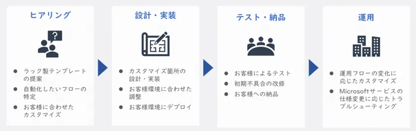 ラックは、Microsoft 365のプラットフォームを用いて、複雑化するセキュリティ運用業務を自動化する「セキュリティ運用自動化支援サービス for Microsoft 365」を提供します。このサービスでは、まずお客様の業務フローをヒアリングし、自動化したい部分を特定します。ラックの実績を活かし、ニーズに合わせた提案やカスタマイズを行った後、お客様の環境に最適化した設計と実装を進めます。テストを通じて問題を解決し、修正後に納品します。運用段階では、継続的に改善を図りながら、将来の新サービスへの対応も見据えたサポートを提供します。さらに、Microsoft Copilot for Securityを使った運用支援も見据えた仕組みも提案します。