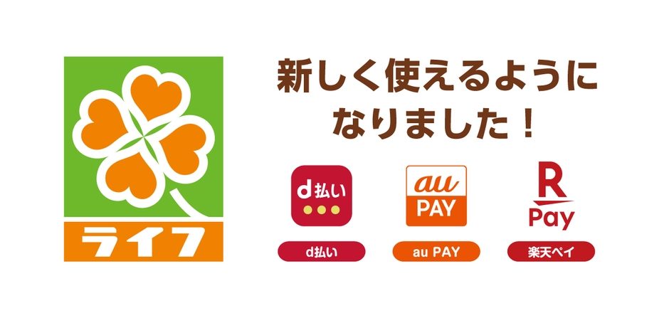 ライフでのお買い物がさらに便利に!新たに「d払い」「au PAY」「楽天ペイ」の各スマホ決済サービスを10月よりライフ全店舗で導入!