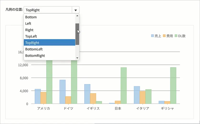 さらに、FlexChartには、凡例の表示位置を従来の上下左右に加え、チャートの四隅(左上、右上、左下、右下)にも設定できる機能を追加しました。このほかにも、数多くの機能追加や機能改善を行っています。