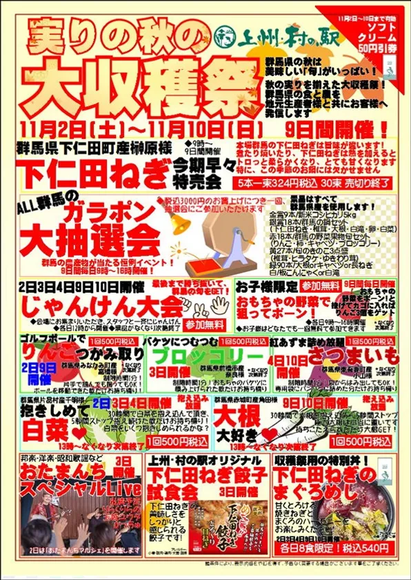 株式会社つつじ庵(所在地:群馬県渋川市、代表:河越 敬仁)が運営する上州・村の駅は、群馬県内の生産者様の農産物や加工品、惣菜、パンなどをはじめ、地元素材を使ったオリジナル商品なども多数販売する群馬県の食のテーマパークです。移りゆく季節によって、様々な農産物の旬を楽しんでいただける事が上州・村の駅の一番の魅力となっています。特に「秋」はもっとも群馬の美味しい旬が集まる季節。そこで、群馬県の農産物の美味しさや魅力を発信する為『実りの秋の大収穫祭』を9日間となる11月2日(土)~11月10日(日)まで開催します。旬の野菜や果物を使った様々なイベントやメニュー、契約農家様持ち込みの日替わり野菜大特価などで群馬の食と農を盛り上げます。