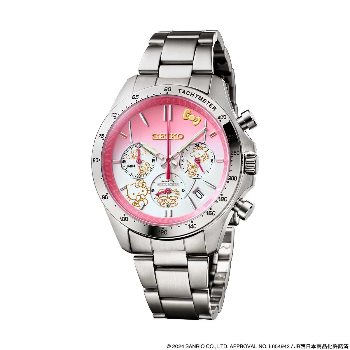 文字盤はハローキティ新幹線の車両カラーにちなんだピンクと白のグラデーションカラー。500系新幹線の象徴であるロングノーズを模した放物線が3つのインダイヤルを結んでいます。