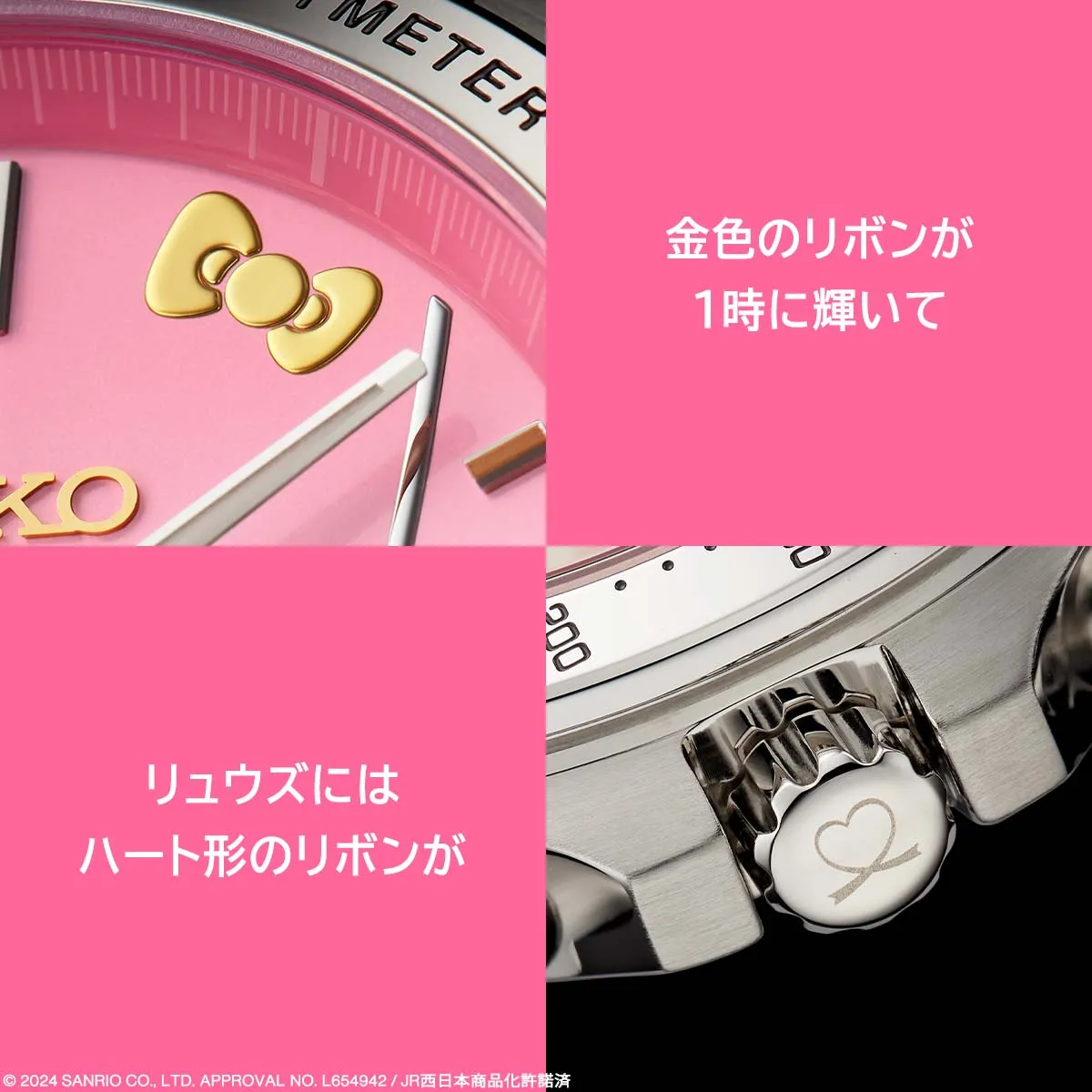 1時位置には金色のハローキティのリボンが輝いて。リュウズにはハートに形どられたリボンがさりげなく。