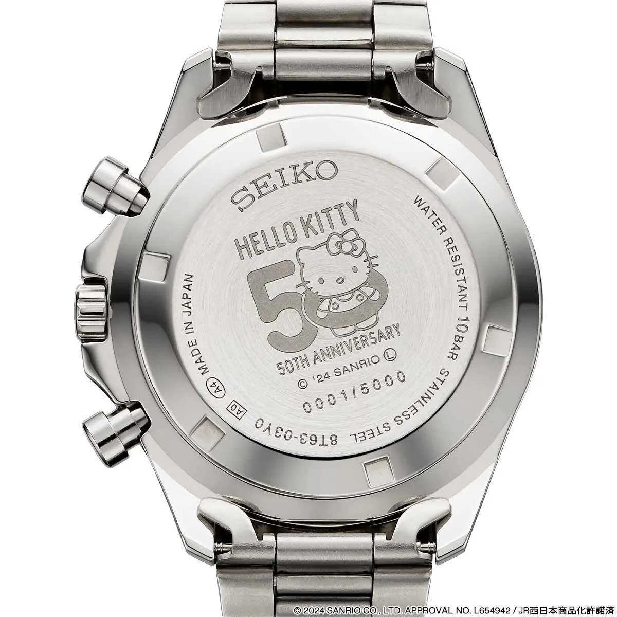 裏蓋にはハローキティ50周年記念ロゴを刻印。1~5000のエディションナンバーが入ります。