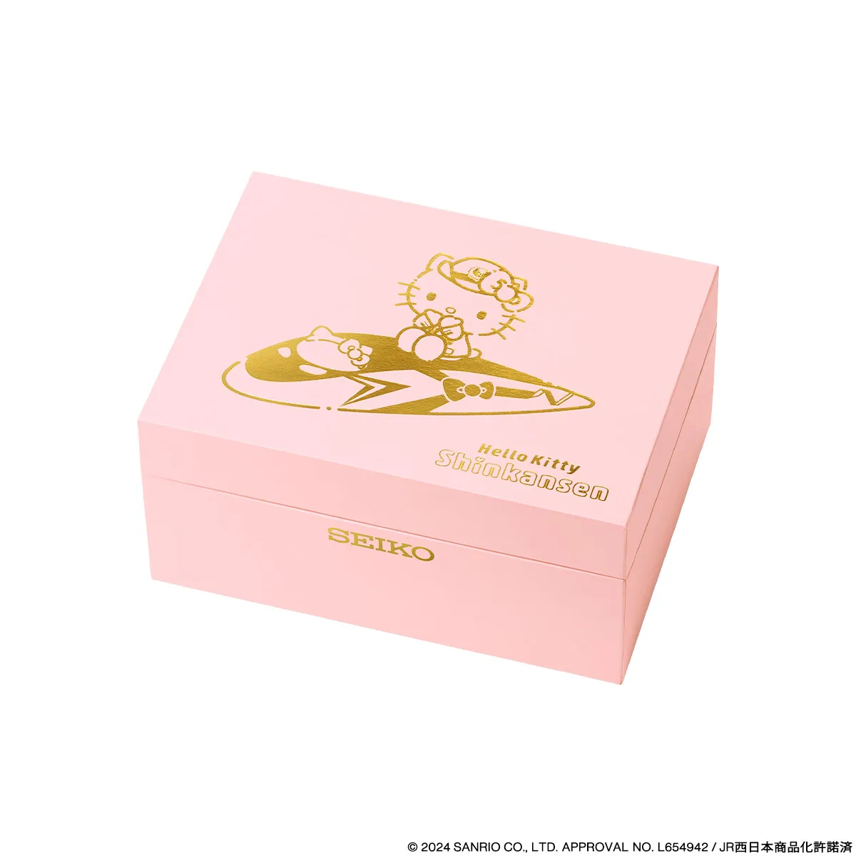 腕時計は新幹線に乗ったハローキティの箔押しが煌めく、ピンクの特製ボックスに収めてお届け。