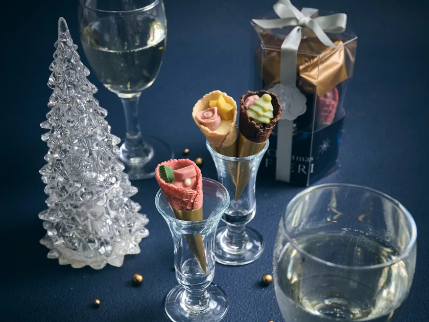 「TOKYOコーン・フルーリ」がクリスマス仕様で再登場。バニラコーン、イチゴコーン、チョココーンにクリスマスオーナメントの靴下、スター、ツリーをトッピングした一口サイズの可愛い花束ショコラです。クリアパッケージにシルバーのリボンをかけたデザインは、クリスマスのテーブルを彩る一品としてもお楽しみいただけます。また、プチギフトとして気軽に贈ることができ、大切な方やお世話になった方へのささやかな贈り物としても最適です。