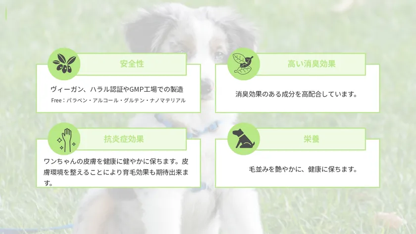 厳格なGMP工場で製造を行い、アルコールを使用せず植物性の肌に優しい成分を主に使用しているので、ワンちゃんだけでなく、飼い主様の手にも優しいシャンプーです。