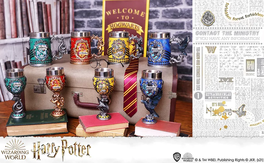 ハリー・ポッターに登場する4つの寮をモチーフにしたコレクタブルなタンカードとゴブレット。