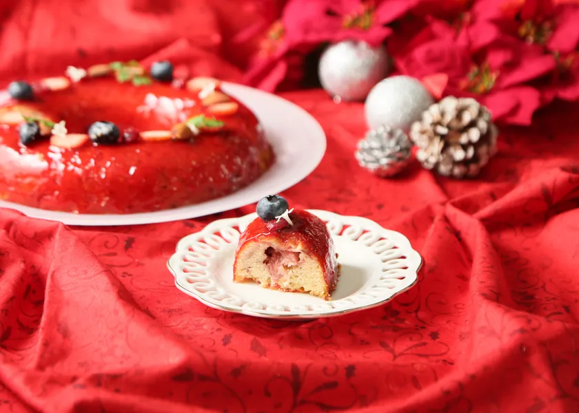 クリスマスのお祝いにサンタクロースがお客さまのために手作りした、クリスマスリースをイメージ。中にはいちごを混ぜ合わせ、プチっと弾ける食感もお楽しみいただけます。艶やかに輝く真っ赤なナパージュをまとったエンゼルケーキは、優しい甘さといちごの甘酸っぱさが魅力です。