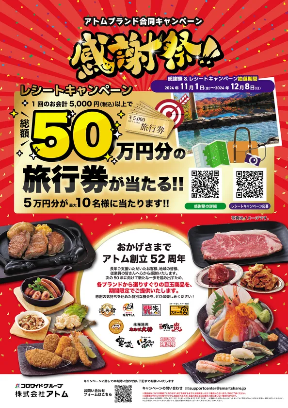 「アトムブランド合同キャンペーン 感謝祭」では、創立から52年、長年ご支援いただいたお客様、地域の皆様、従業員の皆様へ心から感謝を込めて、アトムが運営する10ブランドから選りすぐりの計22品の感謝祭特別メニューを販売するほか、抽選で5万円分の旅行券が最大10名様に当たる、レシートキャンペーンも実施します。