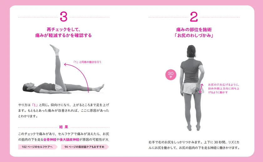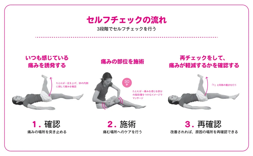 本書では先述の3つの原因を特定するためのプロセスを、自分自身で行う方法を解説しています。痛みやしびれの原因を突き止められると、自分自身で適切なセルフケアもできるようになります。
