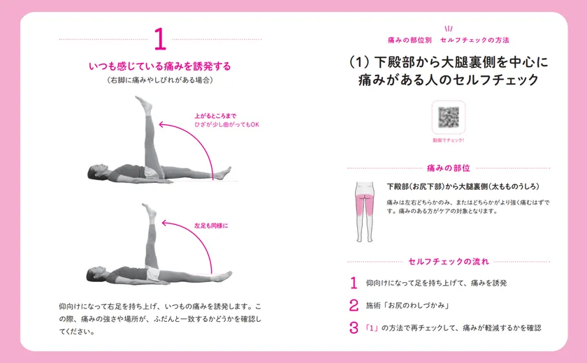 本書では先述のセルフチェックの具体的な方法を痛みの部位別に紹介しています。書籍にある二次元コードをスマートフォンなどで読み取ると、実際の方法を映像で見ることができるので、正確な方法を理解することができます。