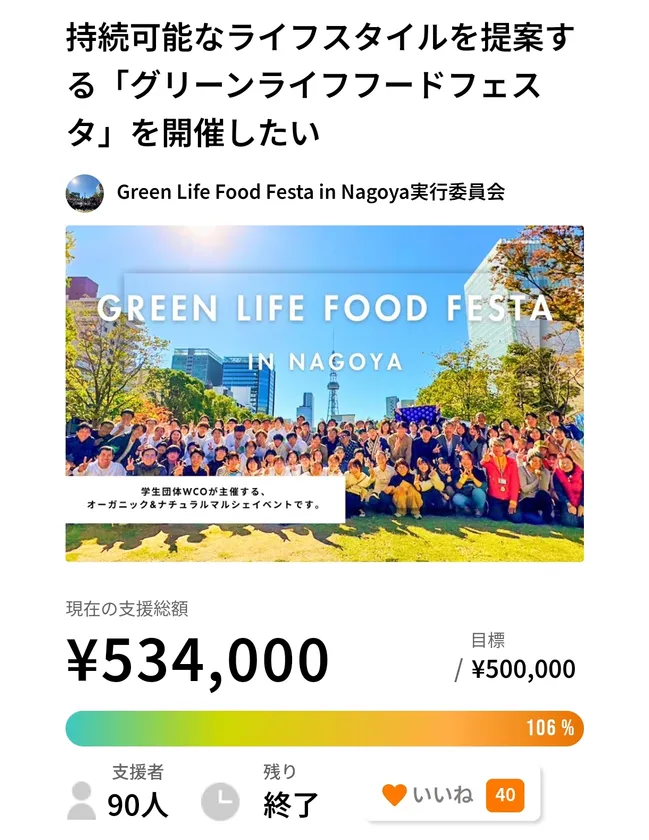 クラウドファンディング企画「持続可能なライフスタイルを提案する『グリーンライフフードフェスタ』を開催したい( https://for-good.net/project/1000879 )」では、開催のための資金 50万円を達成しました。