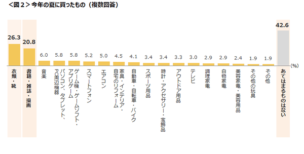 この夏買ったものは、「衣類・靴」が26.3%とトップ。「書籍・雑誌・漫画」がそれに続く。