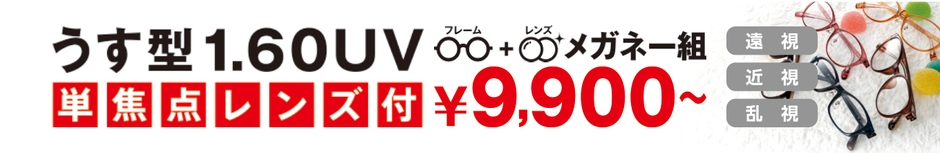 うす型1.60UV単焦点レンズが付いて、メガネ一組 税込¥9,900より、その他豊富にご用意しております。