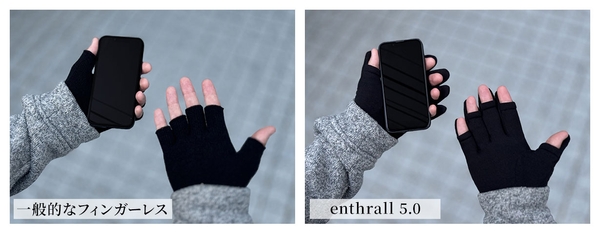 enthrall 5.0 は露出範囲を最小限に、さらにすべての指を独立して開閉できるので、その時々の必要に応じて防寒性を保ちながら指出し操作が可能です。