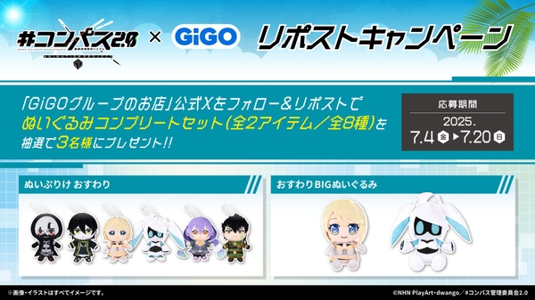 Xアカウント( https://x.com/GENDA_GiGO )をフォローの上で、該当の投稿をリポストされたお客さまの中から抽選で3名さまに「ぬいぐるみコンプリートセット(2商材全8種)」をプレゼントいたします。