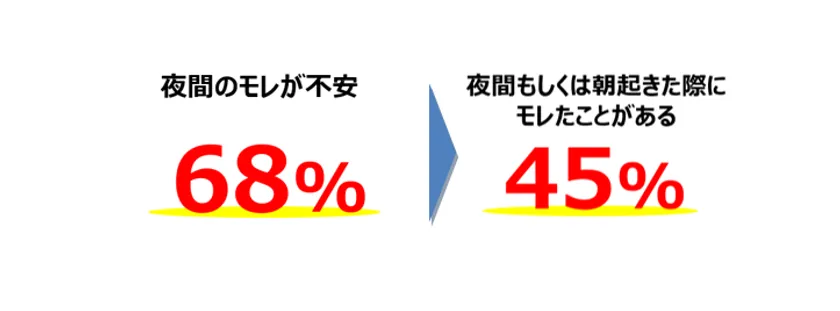 近年、軽い尿モレ症状においても適切な対処を始める方が増えたことで、軽度失禁ケア用品の市場規模は拡大しています。※1しかしながら、これまでは夜専用品の品ぞろえが不十分だったことなどにより、68%の方が夜間の尿モレに不安を感じています。また、「就寝中の体勢変化」や、「体を起こした際、急な尿意に襲われる」ことなどにより、45%の方が夜間もしくは朝起きた際に下着にモレた経験をして悩んでいます。このようなことが原因となって睡眠の質が低下し、日中の活動にも影響を及ぼしています。