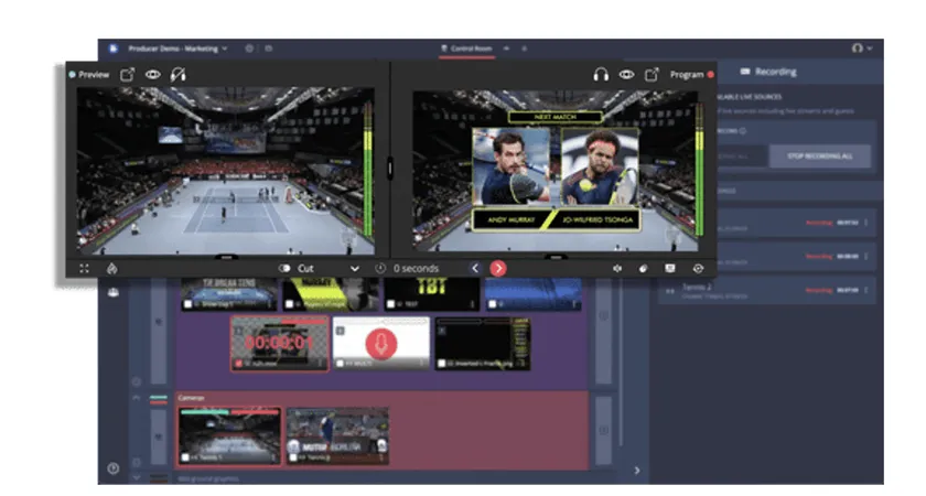 クラウドネイティブのビデオ編集および配信プラットフォーム「Grabyo」は、映像制作・動画配信・マネタイズ機能を統合したSaaSツールです。ビデオスイッチャー、オーディオミキサー、ビデオクリッピング・編集、AIハイライト制作、動画配信などの機能をクラウドに集約し、配信元(会場)の機材構成を最小限に抑えることで、場所を問わない柔軟な運用を実現します。