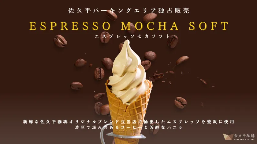 また、佐久平珈琲スタッフ達が試作を重ねて完成した「エスプレッソモカソフト」は、カフェ内で抽出した新鮮なエスプレッソを贅沢に使い、コーヒーのほろ苦さとバニラの甘さが絶妙に調和した一品です。世代を超えて楽しんでいただける芳醇な香りと優しい味わいが特徴です。