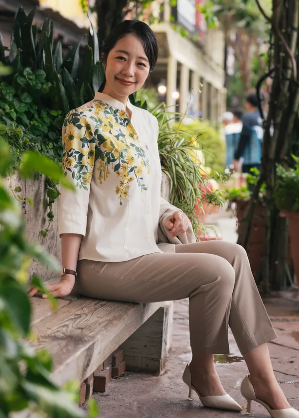 沖縄の公園や野山に自生する植物を透明感のある水彩タッチで描いた繊細さと抜け感を感じさせる一着。隠れたテントウムシ柄がさりげないかわいらしさをプラスしています。