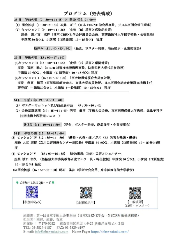 近年重要性が増大している「CBRNE(複合)災害対策へのアプローチ」をテーマとして、新設日本CBRNE学会/NBCR対策推進機構(事務局担当)共同主催で、第一回学術大会を対面およびオンデマンド配信で実施し、地方自治体、自衛隊、警察、消防庁職員等防災関係専門家のみでなく、広く大学院生を含む学生、ポストドクター等若手研究者をターゲットに発表の機会を与えます。