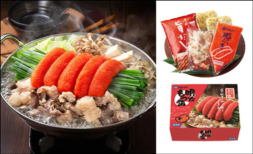 かねふくこだわりの「もつ鍋用特製辛子明太子」をふんだんに使用し、4種類の部位を使用したミックスもつ(小腸・シマチョウ・ギアラ・ハツ)とちゃんぽん麺、だしをセットにしました。