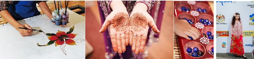 マレーシアの伝統工芸「バティック」の色塗り体験や、天然染料を使ったヘナタトゥー、伝統的なあそび「チョンカ」、マレーシア伝統衣装体験や、マレーマッサージ体験など。