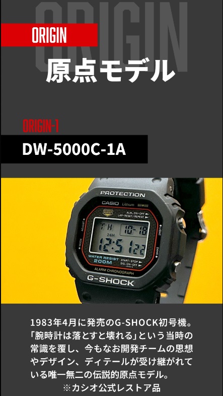 1983年4月に発売のG-SHOCK初号機。「腕時計は落とすと壊れる」という当時の常識を覆し、今もなお開発チームの思想やデザイン、ディテールが受け継がれている唯一無二の伝説的原点モデル