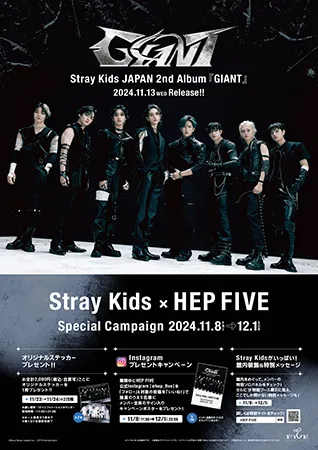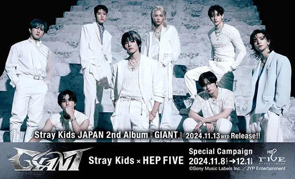 大阪梅田のファッションビルHEP FIVEでは、2024年11月8日(金)~12月1日(日)の期間、世界的な人気を誇るK-POPボーイズグループ・Stray KidsのJAPAN 2nd Album『GIANT』のリリースを記念して「Stray Kids×HEP FIVE Special Campaign」を開催いたします。