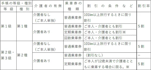 ・介護者とともに利用する場合の乗車券は、同一の種類・乗車区間・有効期間で、同時にお買求めいただいたうえで、同一の列車に乗車するときに限り有効です。