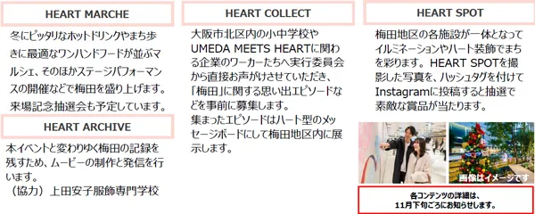 2023年からスタートした「HEART MARCHE」は規模を拡大し、公共空間を中心に梅田各所で開催します。また事前に実行委員会から大阪北区内の学校や企業に直接お声がけして募集した梅田での思い出エピソードなどを展示する「HEART COLLECT」では、マルシェ開催当日にも参加者を受け付けます。そのほかにも梅田全体がイルミネーションやハート装飾で彩られる「HEART SPOT」では、撮影した写真をSNSに投稿すると抽選で素敵な賞品が当たるハッシュタグキャンペーンを開催します。梅田の冬のまち歩きを存分にお楽しみいただける内容になっています。