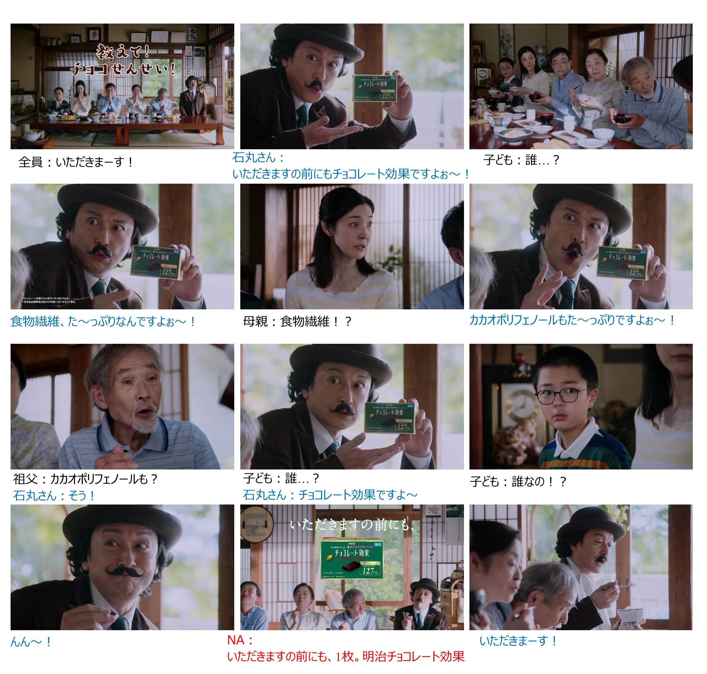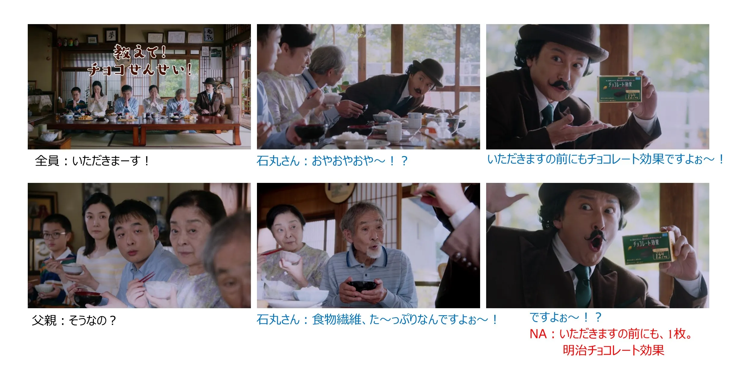 本CMには、『チョコ先生』でおなじみの石丸幹二さんが出演。家族の食卓に登場し、「いただきます」の前にもチョコレート効果がおすすめなことを、コミカルな演技で伝えます。チョコレート効果の魅力をアピールする度に目が見開いていく、石丸さんの豊かな表情にご注目ください。