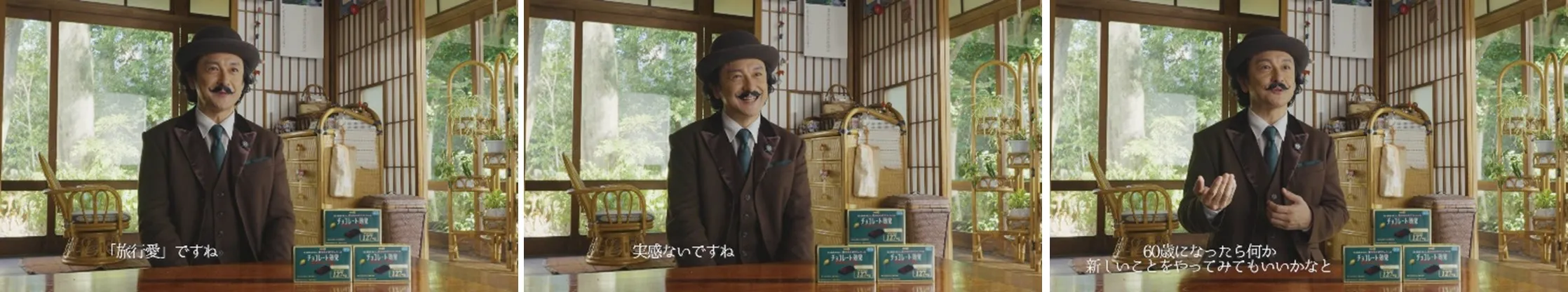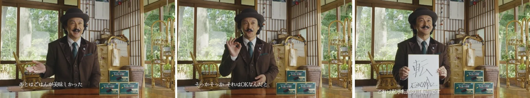 今回は、「お茶の間に上がってきたチョコ先生」という設定になっていまして、なんと皆さんの食卓にお邪魔して、いろんなことを申し上げる、そんなCMになっております。ごはんとチョコレートというものの接点を自分の中で考えてみたんですけども、「これ、なかなか合うな」と思いました。実際やってみましてね。ほかの方たちも、非常にこの設定を楽しんでいらっしゃいました。あとは、ごはんが美味しかった(笑)。消え物って普通、いい具合に(ほどよい量を)食べるんですけど、かなり皆さん必死に食べてらっしゃったのが印象的でしたね。