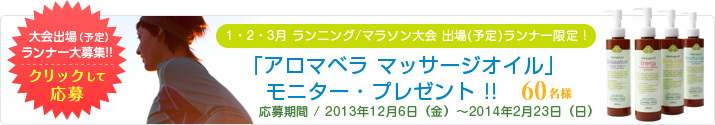 アロマベラ モニター募集本キャンペーンでは、2013年12月6日から2014年2月23日までにご応募いただいたランニング / マラソン大会出場予定のお客様の中から、抽選で合計60名様に『アロマベラ マッサージオイル』をプレゼントいたします。