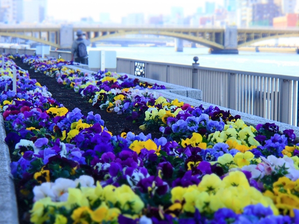 隅田川テラスには、形も規模もさまざまな花壇が多く設置され、四季折々に咲く花壇の花々が、散策する人たちの目を楽しませてくれます。