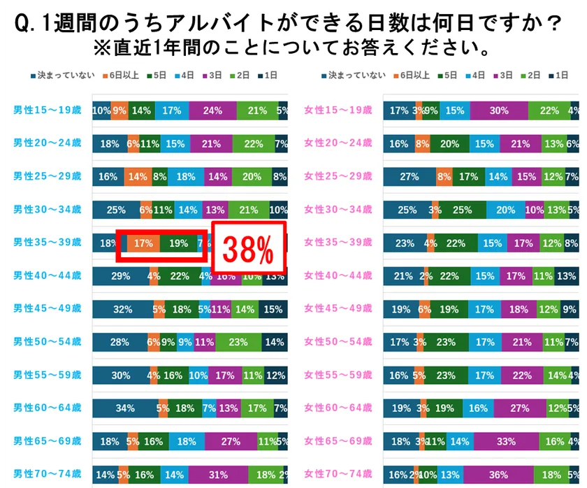 35~39歳の年齢層が、週5日以上働ける割合が最も多く、週5日以上働ける割合は「38%」と、全体の約4割でした。