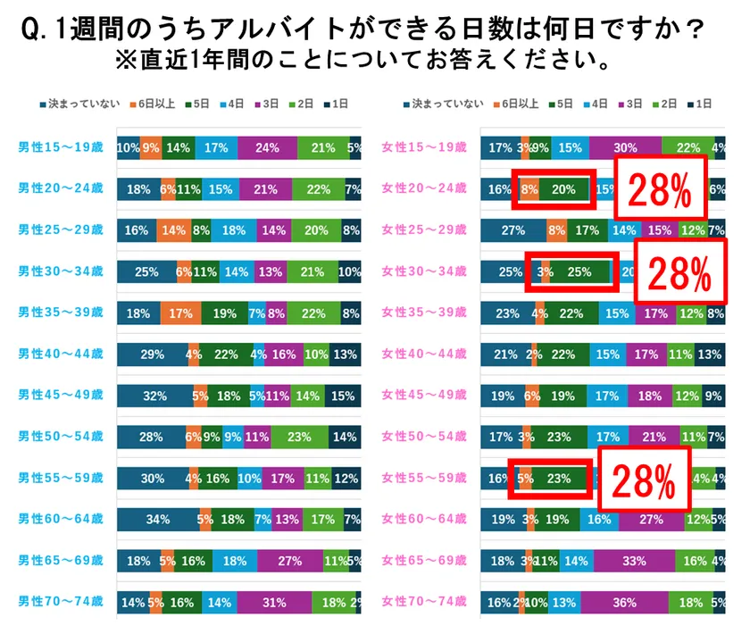 女性は20~24歳、30~34歳、55~59歳が、週5日以上働ける割合が多く、週5日以上働ける割合は「28%」と、全体の約3割でした。